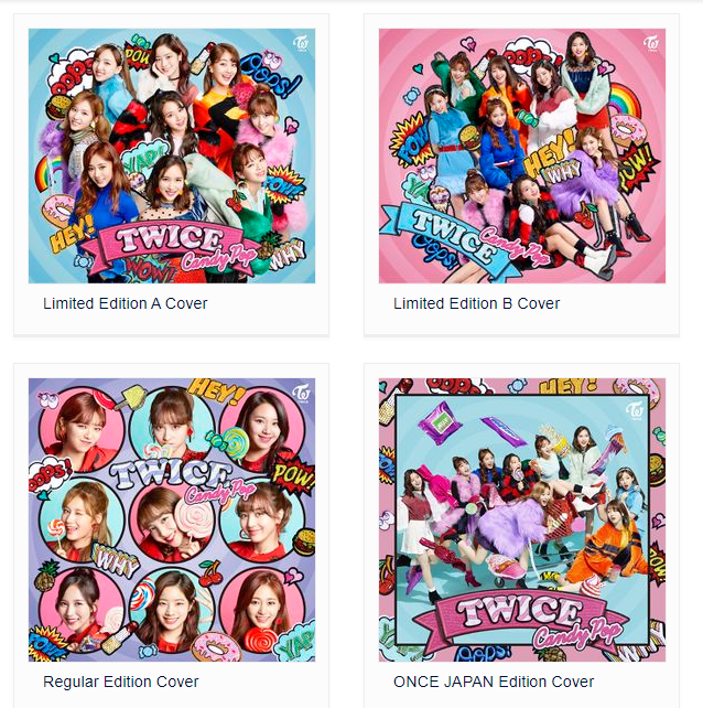 "Candy Pop" is the second Japanese single released by TWICE. It was released in four versions: two limited CD+DVD editions (A & B), a regular CD edition, and a limited ONCE JAPAN fanclub CD edition. Additionally, the first three editions can be purchased together as the WARNER MUSIC DIRECT box set. Limited editions A & B and the regular edition come with 1 of 10 trading cards. Additionally, the limited edition A comes with a 24-page lyric booklet and the ONCE JAPAN edition comes with 9 Valentine's Day-themed interchangeable jackets and event application. The song "BRAND NEW GIRL" was used as a commercial theme for Clova Friends Futago Dance-hen.