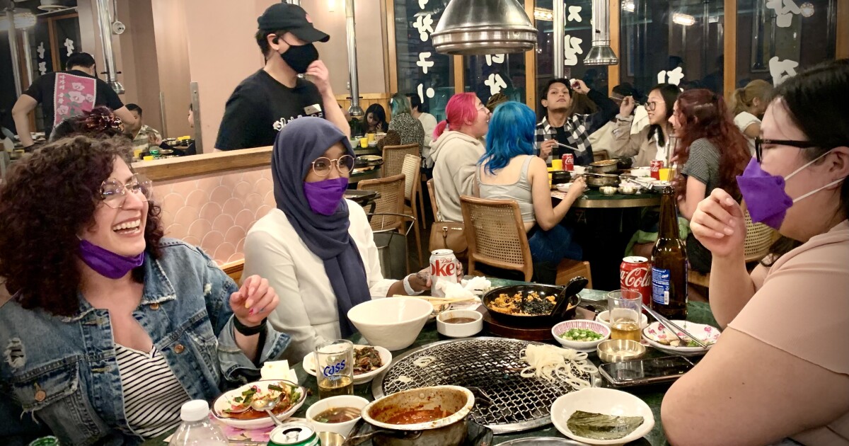 Three young women in their 20s laugh as they dine at a crowded restaurant with a Korean BBQ grill at their table, surrounded by plates of food.Friends Daniela Bohorquez, Hilal Mohamed and Tiffany Blackkettle (l. to r.) dine at Ahgassi Gopchang in Koreatown. (Josie Huang / LAist )